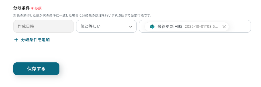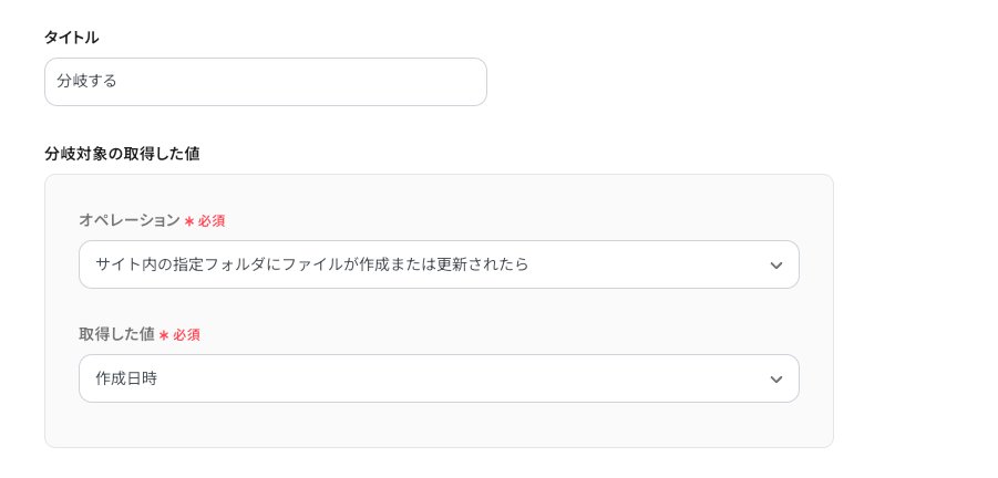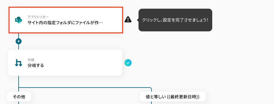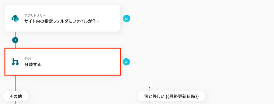 あらかじめデフォルトで値が入力されています。 なお、今回は作成日時と最終更新日時が等しい=ファイルが作成された場合にのみフローを進める という条件で分岐をさせます。
