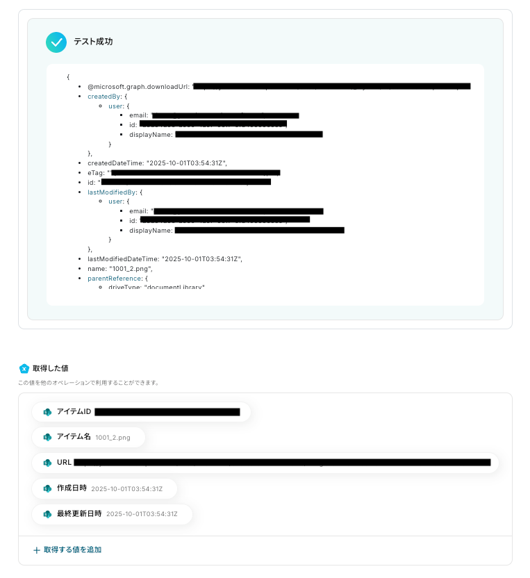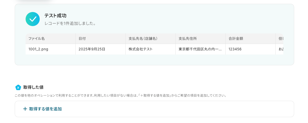 ファイルのアップロードが完了したらYoomの画面に戻りテストボタンをクリックしましょう。 テストが成功すると、以下のように「取得した値 」が表示されます。この「取得した値」は、後のフローで使用します。