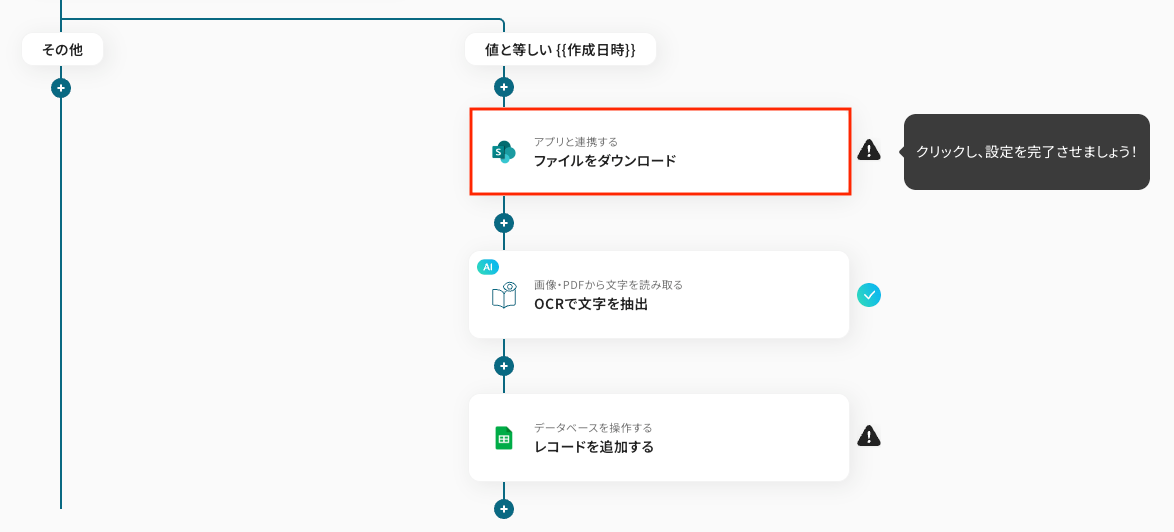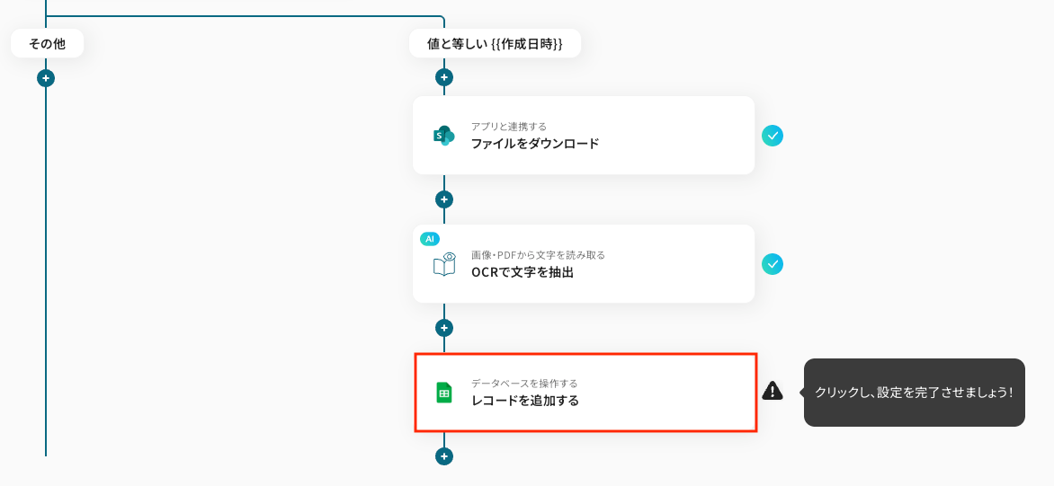 OCRで読み取ったテキストを、Google スプレッドシートに追加するための設定をします。 最後のオペレーションにある、「レコードを追加する」をクリックしてください。