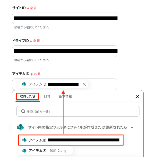 次に、API接続設定 です。 「サイトID」「ドライブID」を候補から選択し、「アイテムID」は取得した値から選択します。