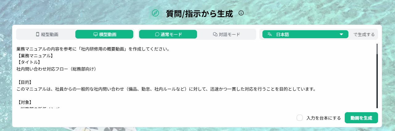 検証③:テキストメモからの解説動画作成 最後に、ビジネス現場での実用性を検証するため、動画生成ツールNoLangを使用しました。 具体的には、「社内問い合わせ対応フロー」という業務マニュアルのテキストを読み込ませ、自動で解説動画を作成できるか 検証します。 対象としたテキストには、受付から分類、エスカレーション先、管理シートへの記録といった詳細な手順が含まれています。