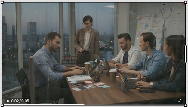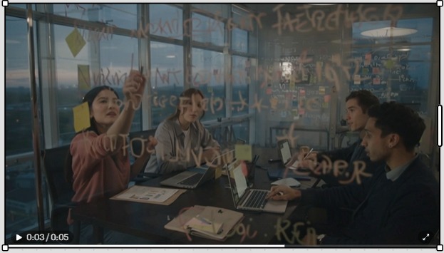 夕暮れ時の近代的なオフィス。若い男女4人のマーケティングチームが、ガラス壁の会議室でブレインストーミングをしている。テーブルの上にはノートPC、付箋、コーヒーカップが並んでいる。カメラは部屋の右側からゆっくりと左へパンしながら、メンバーがホワイトボードにアイデアを書き込み、真剣に議論している様子を映す。自然なシネマティックライティング、4K、リアルな質感、落ち着いたビジネスドキュメンタリー風、オフィスの外には都会の夜景がぼんやり見えている。 【英語プロンプト】