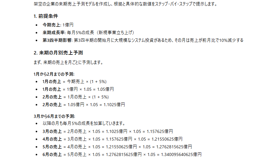 Thinkingモデルは単なる回答ツールではなく、「専門コンサルタント」に近いアウトプットを実現 しています。計算プロセスをオープンに開示する姿勢は、ビジネスにおける説明責任(アカウンタビリティ)を十分に果たせるレベルにあります。