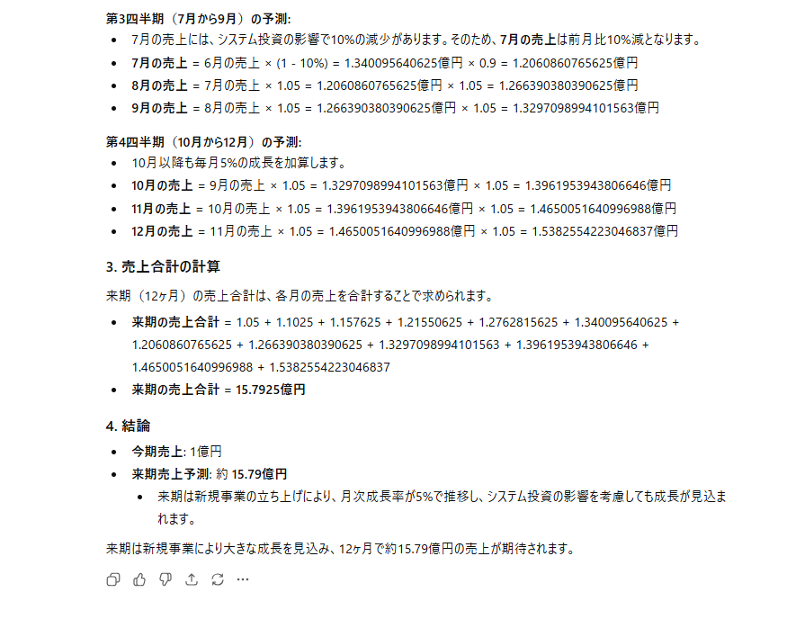 GPT-5.4 Thinking(合格) : 第3四半期の開始を正しく「7月」と捉え、全12ヶ月分の複利計算を小数点以下まで極めて緻密に実行しています。7月の10%ダウン処理、およびその後の5%成長再開も完璧に反映されており、最終的な「約15.79億円」という数値は論理的に正しい結果です。