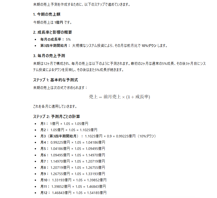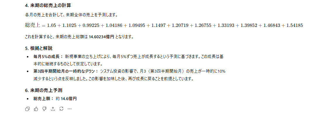 GPT-5.3 Instant : ステップ分けはされているものの、計算の根拠となる式が簡略化されすぎており、なぜその数字になったのかを追跡するのが困難です。また、四半期の定義ミスにより、ビジネス文書としての妥当性に欠けます。