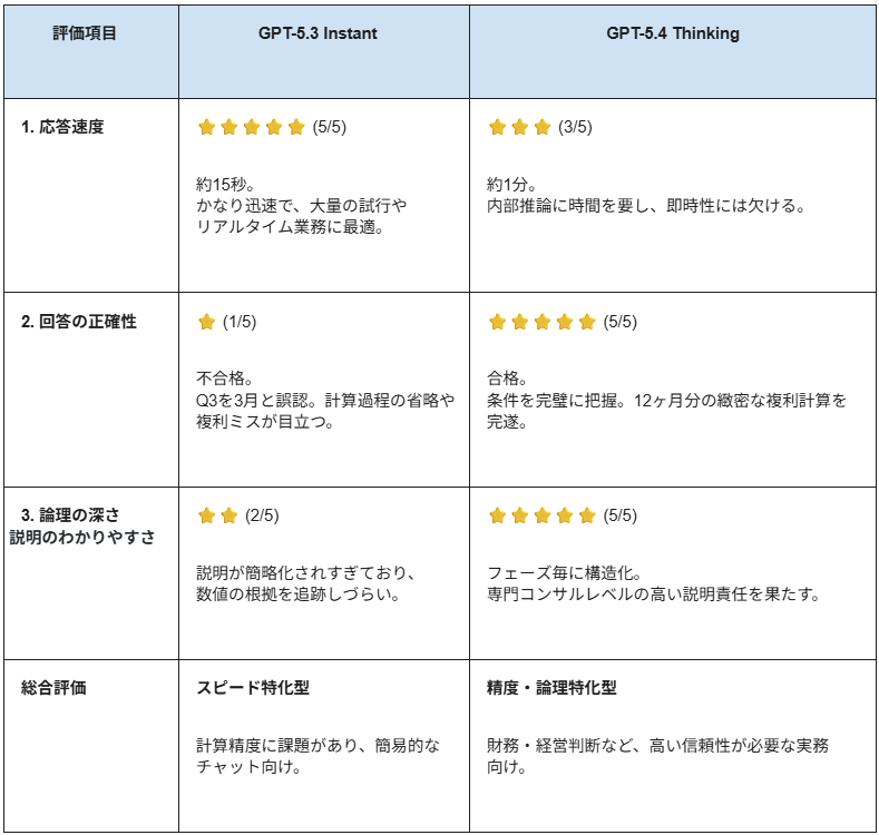 Instantは複雑な条件を見落とすリスクが高く、数値の信頼性が求められる財務・経営シミュレーションにはThinkingモデルが不可欠であることが実証 されました。