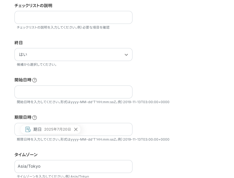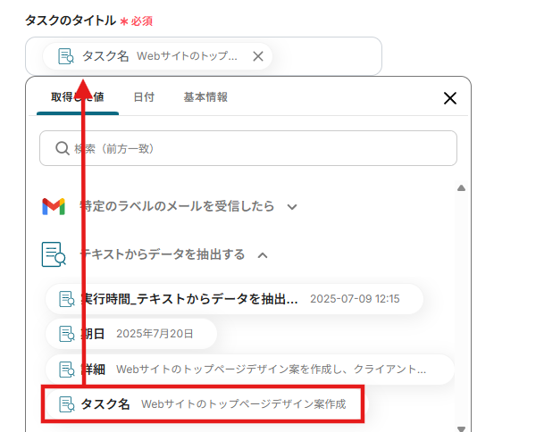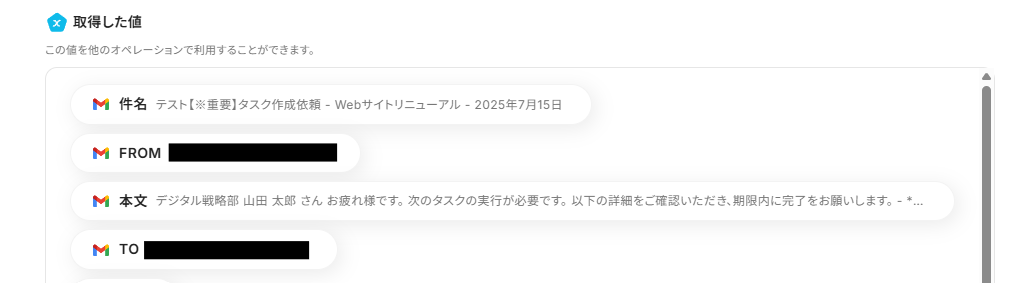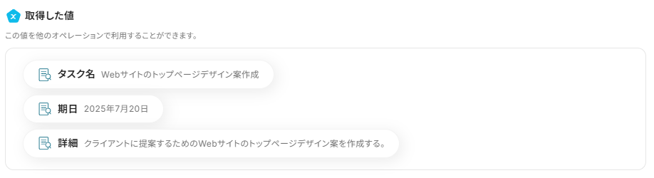タスク名、タスクの内容、期限日時は以下のように表示される「取得された値」から抽出した値を入力しましょう。