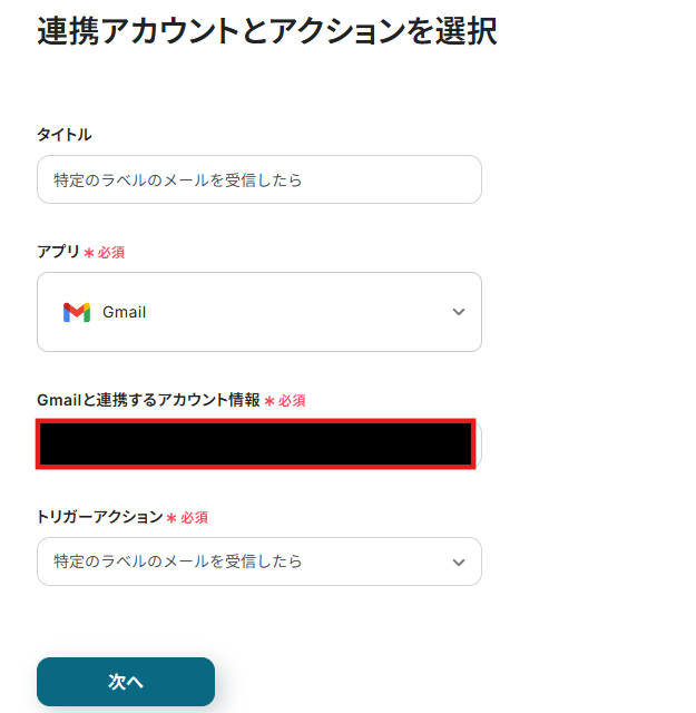 連携アカウントとアクションを選択する画面が表示されるので、今回連携するGmailのアカウントを確認し「次へ」をクリックします。