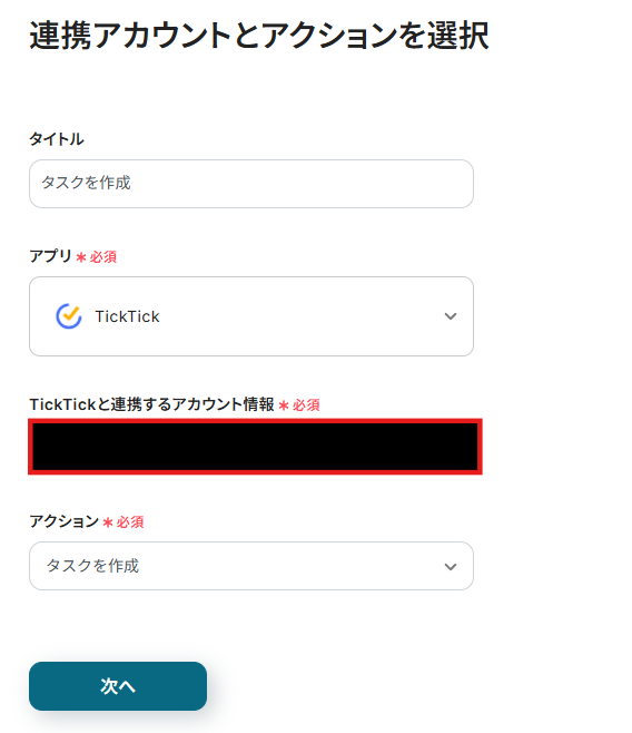 連携アカウントとアクションを選択する画面が表示されるので、今回連携するTickTickのアカウントを確認し「次へ」をクリックします。