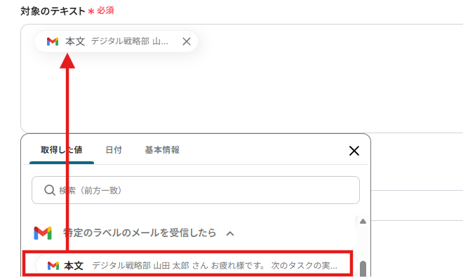 対象のテキストには以下のように「取得した値」からGmailの本文内容を選択しましょう。