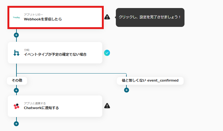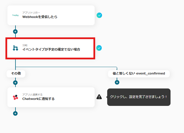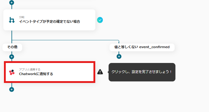 以下の分岐の箇所では、TimeRexで取得した情報を元に「イベントタイプが予定の確定でない場合」にChatworkに通知が届くように設定されています。