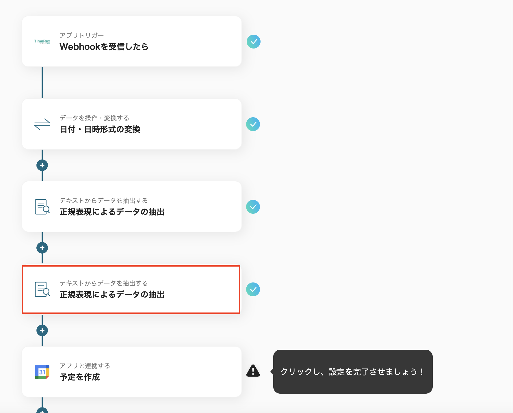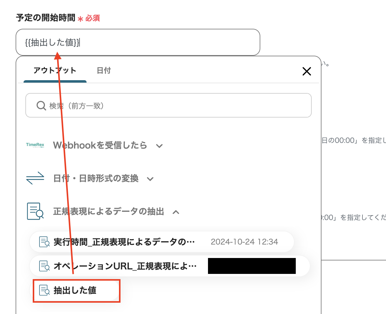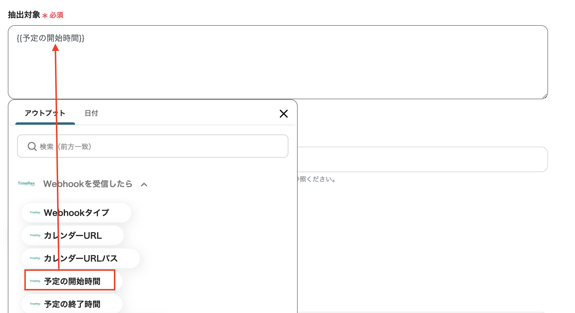 抽出対象には、TimeRexの「予定の開始時間」を取得した値から選択しましょう。