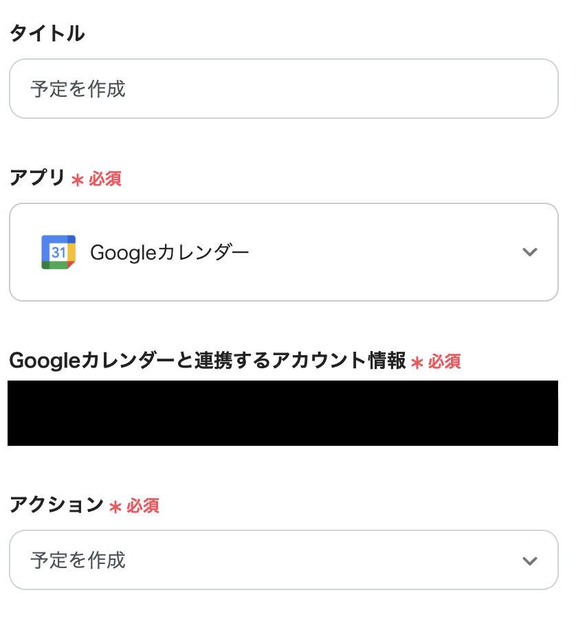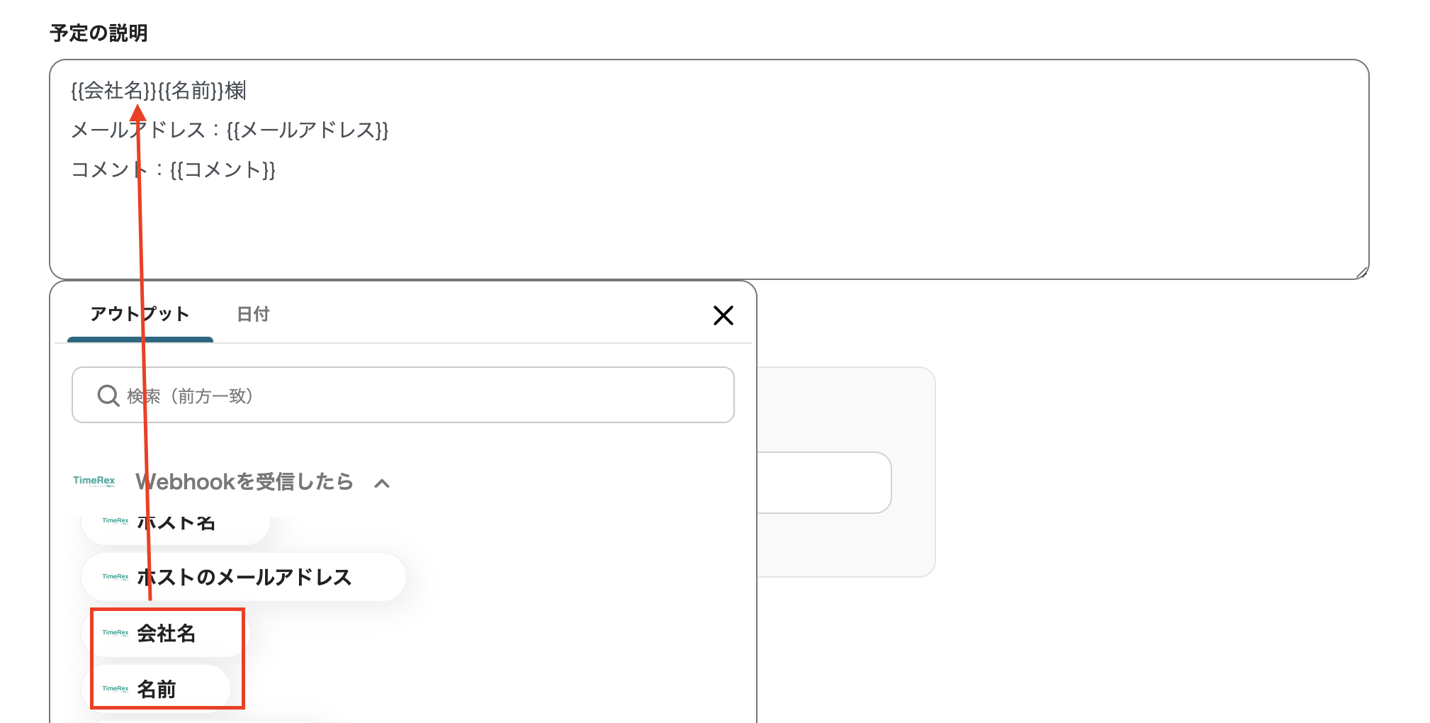 Googleカレンダーの登録時には、取得した情報を変数として組み込むことも、固定の文字列を入力することもできます。