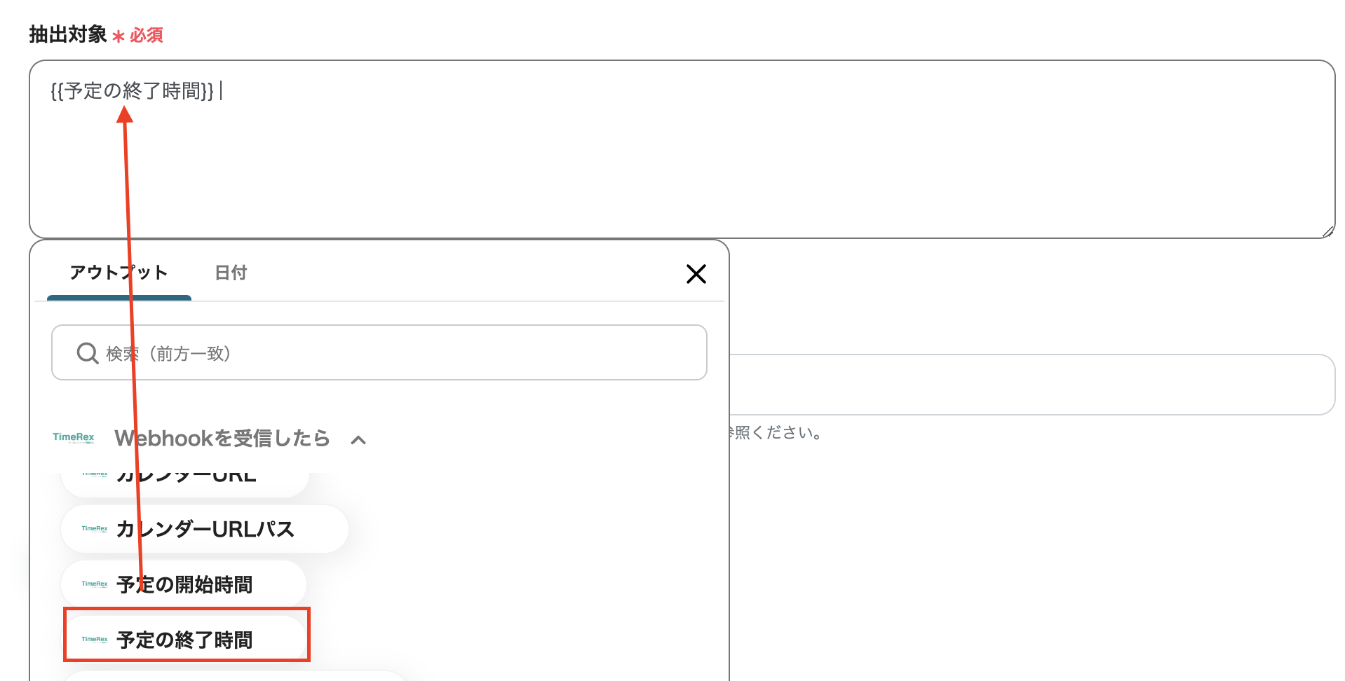 抽出対象には「予定の終了時間」をTimeRexの取得した値から選択しましょう。