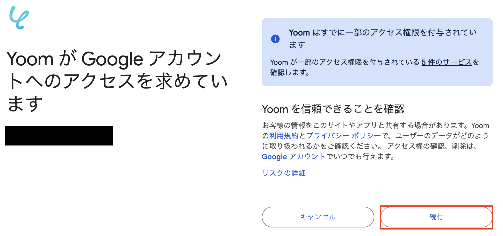 YoomがGoogleアカウントへのアクセスを求める画面で、「続行」を選択します。