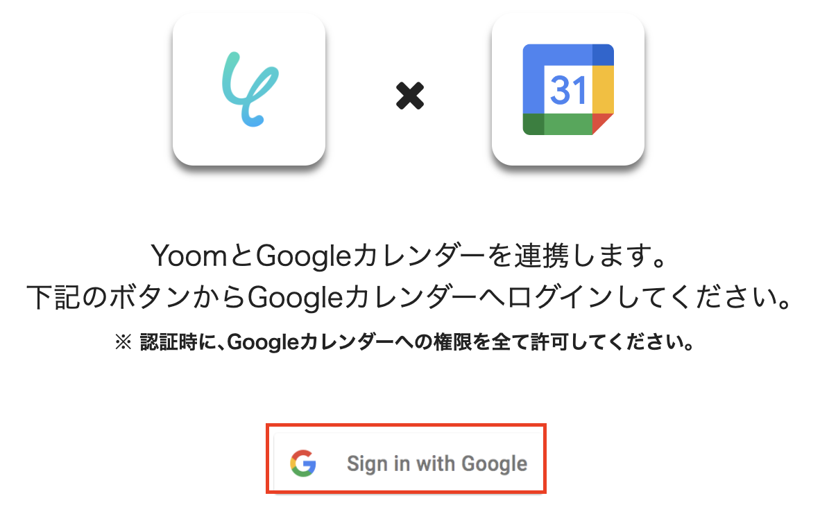 YoomとGoogleカレンダーを連携する画面で「Sign in with Google」をクリックしましょう。