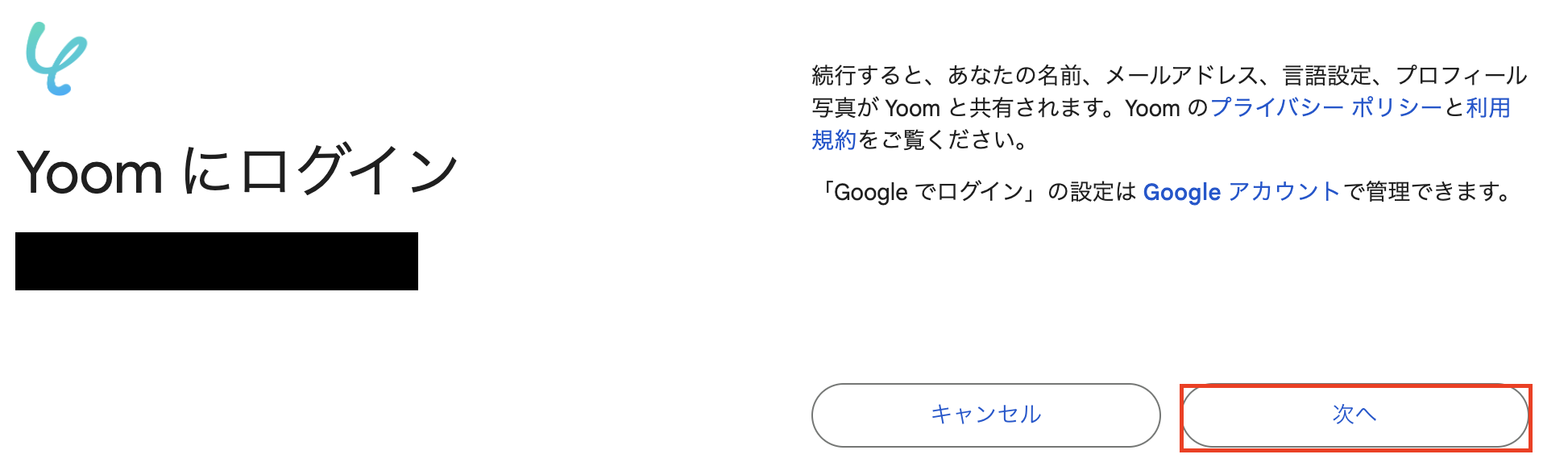 Yoomにログインの画面で「次へ」をクリックしてください。