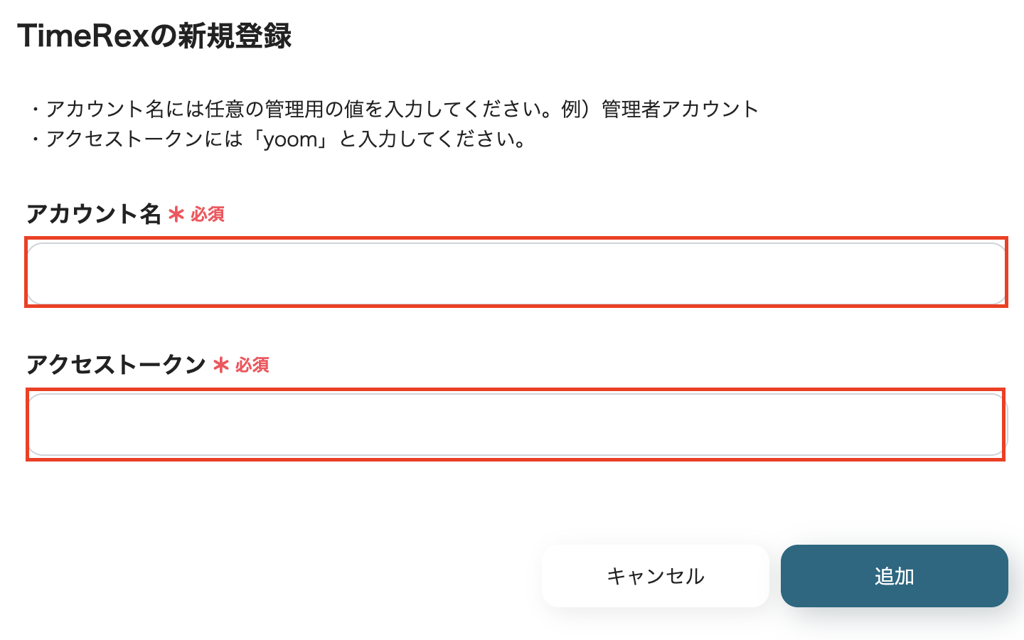 アカウント名には任意の名前を、アクセストークンには「yoom」と入力しましょう。