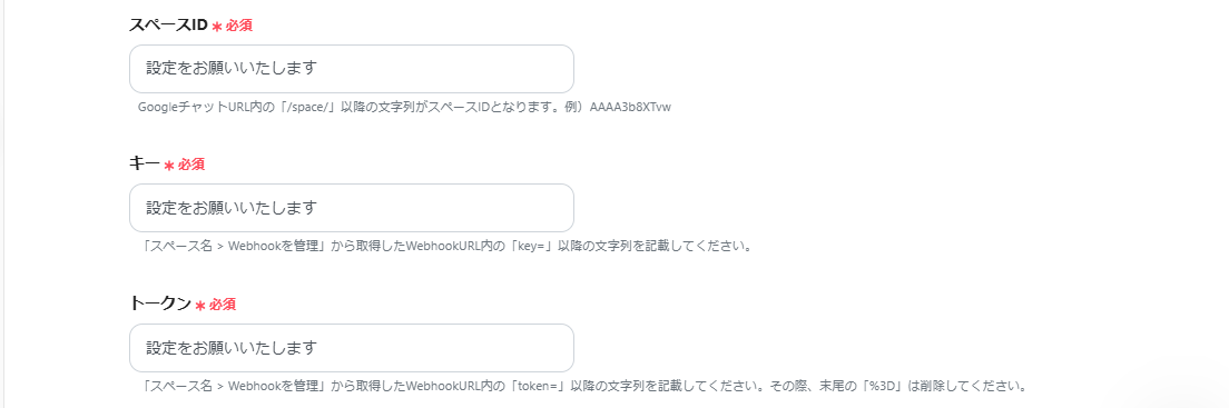 スペースID・キー・トークンは、上記画面の注釈を参考に設定してください。
