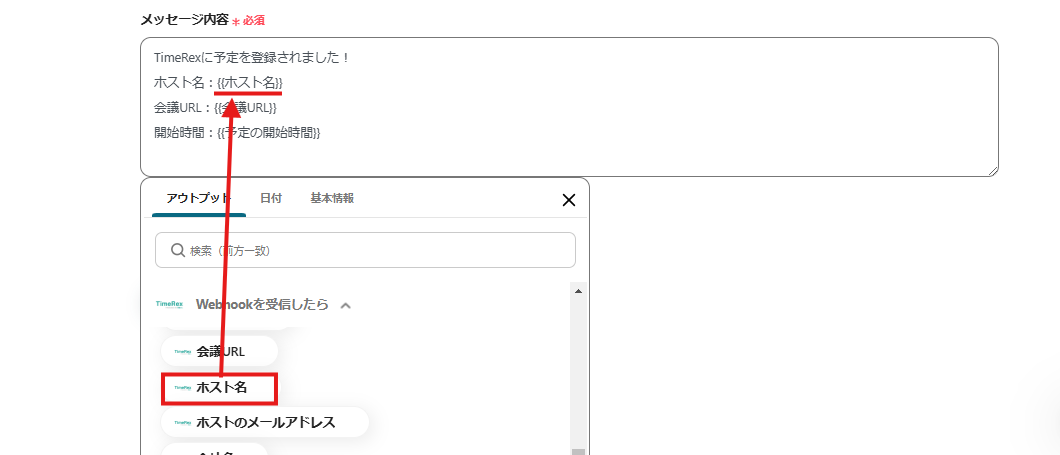 このように設定すると、TimeRexに登録された予定から「ホスト名」「会議URL」「予定の開始時間」を自動で取得し、Google Chatに引用しメッセージを送ることができます。
