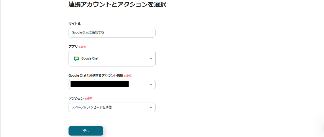 続いて、「Google Chatに通知する」を押してアクションを設定します。