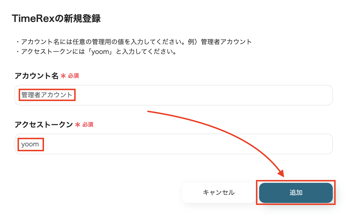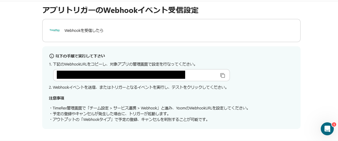 上記画面の注釈を参考に、TimeRexの設定画面にWebhook URLを設定します。