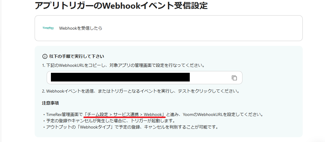 上記画面のWebhookURLをコピー後、TimeRexの管理画面で設定を行なってください。