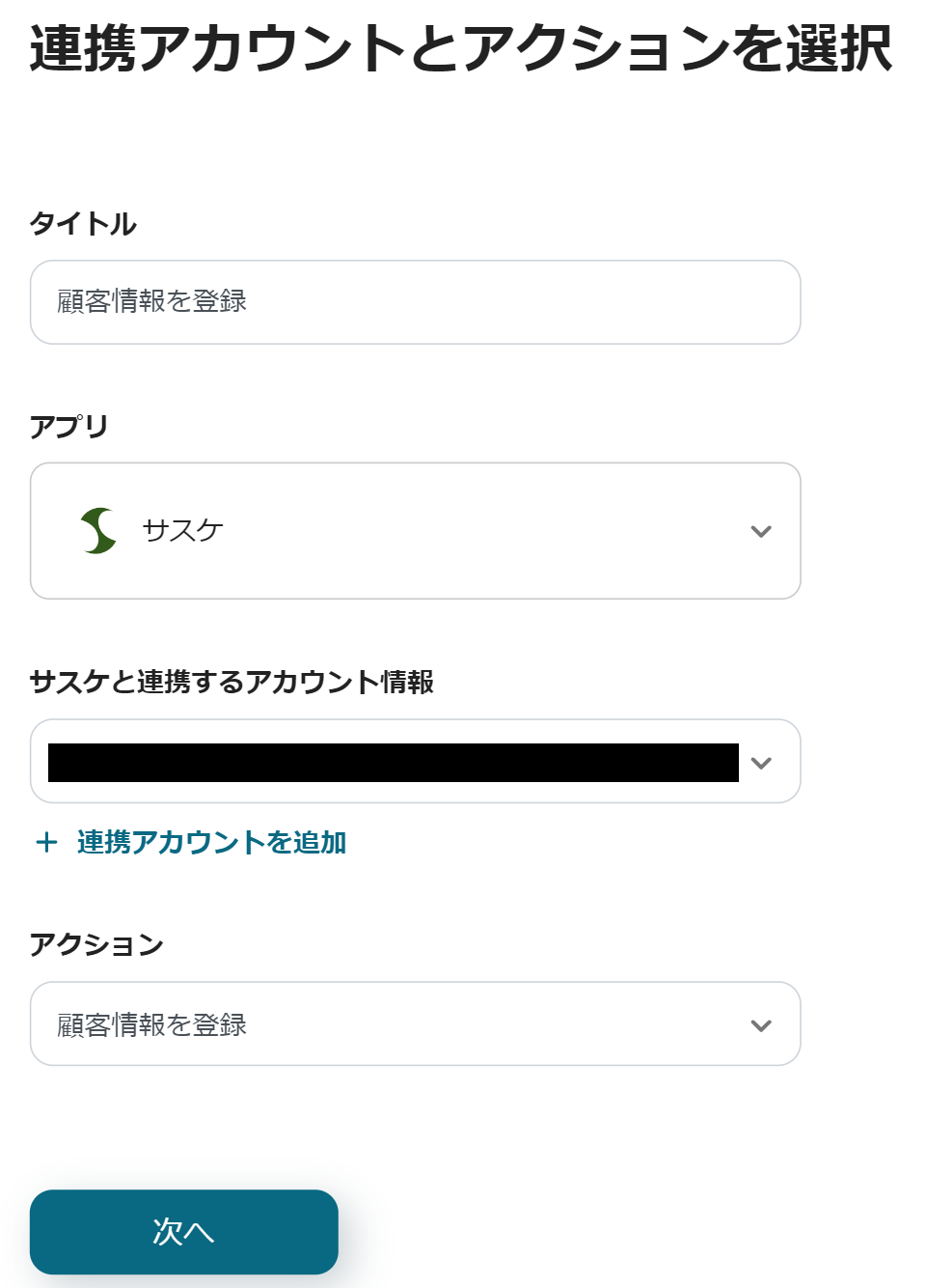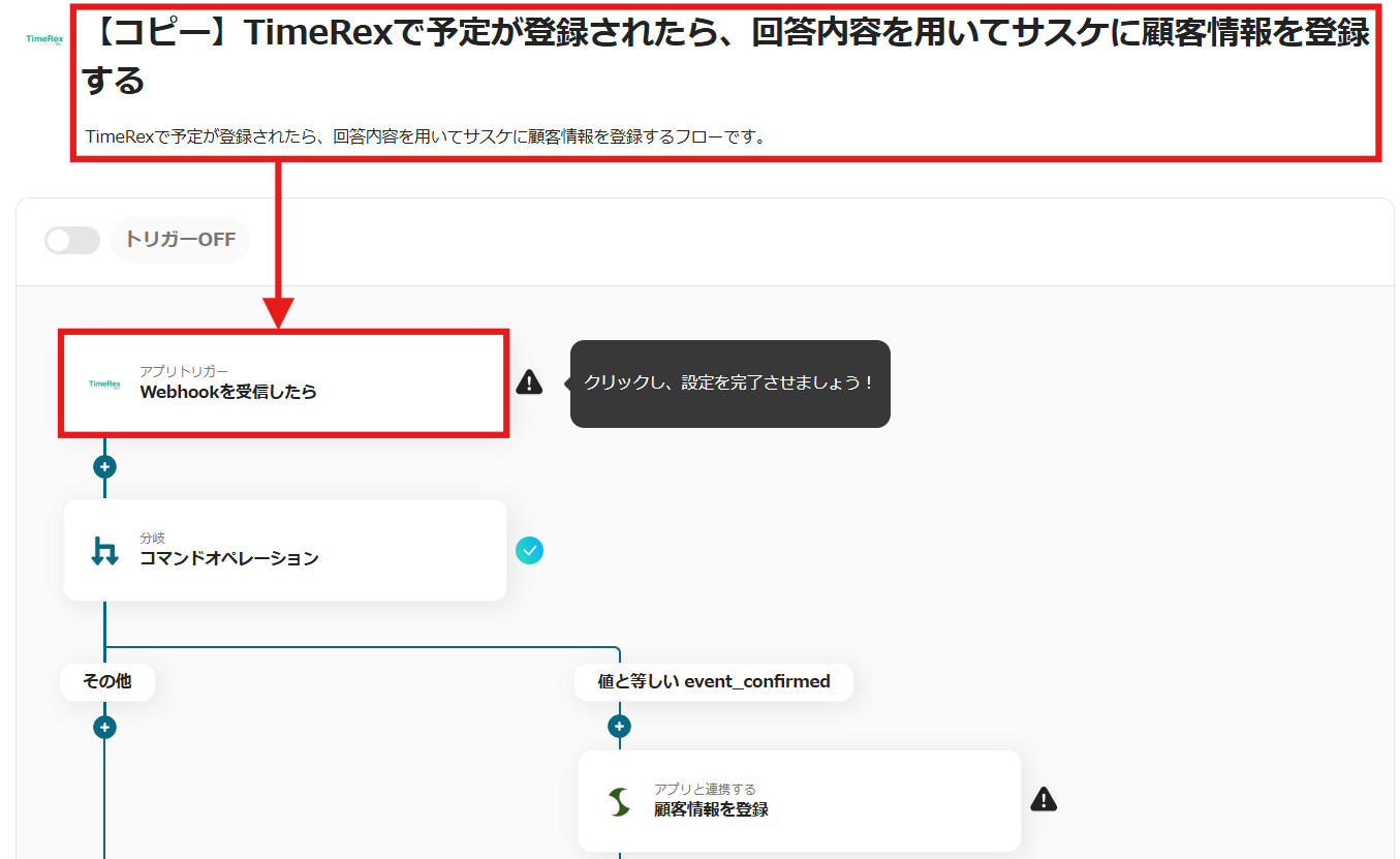 TimeRexで予定が登録されたら、回答内容を用いてサスケに顧客情報を登録するフローです。