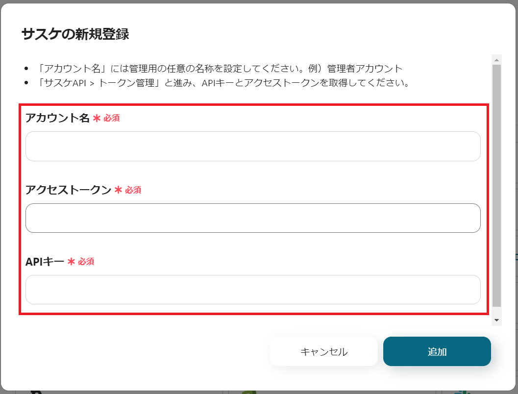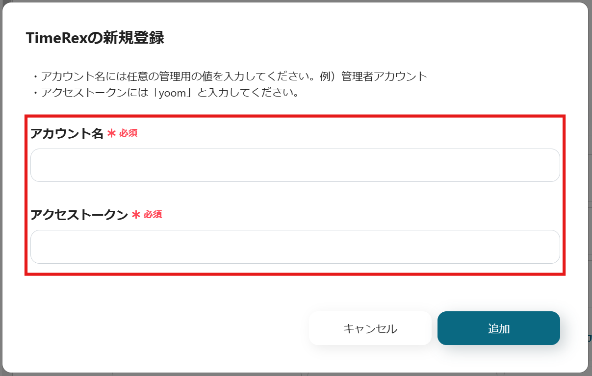 TimeRexの新規登録画面が表示されたら、説明に沿ってアカウント名とアクセストークンを入力し、追加をクリックしてください。