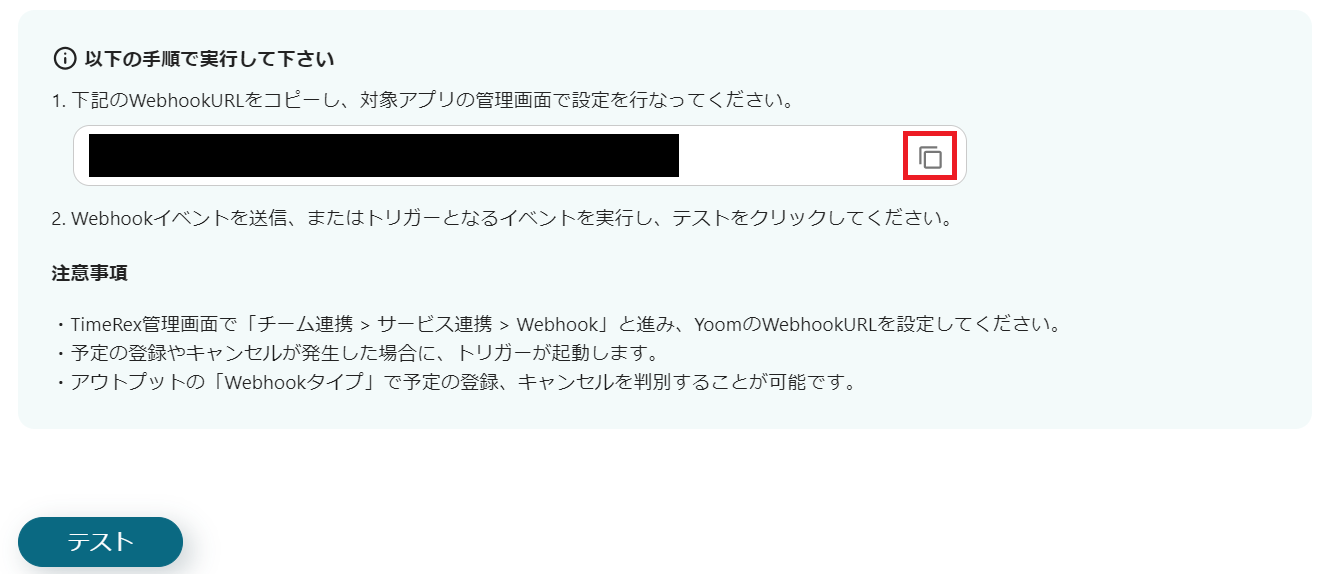 設定が完了したら、Webhookイベントを送信するか、トリガーとなるイベントを実行して「テスト」をクリックしましょう。