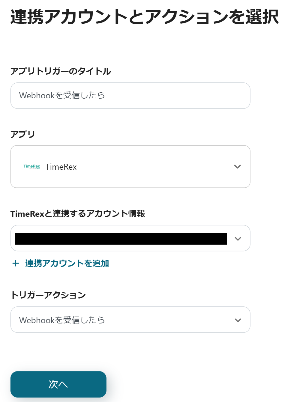 最初にTimeRexの設定を行うので、「Webhookを受信したら」をクリックします。