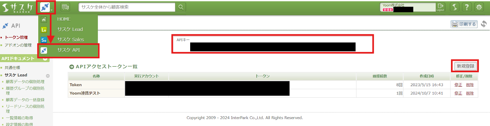 以下のようにトークン管理が表示されるので、「APIキー」を確認し、右側にある「新規登録」でアクセストークンを取得してください。