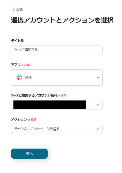 続いて、Slackにメッセージを送信するアクションの設定を行いましょう。