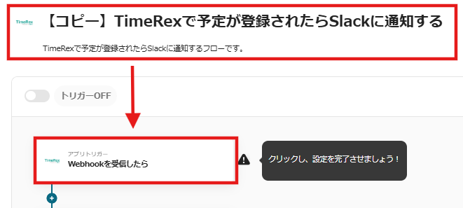 最初に、TimeRexの設定を行うので、「Webhookを受信したら」をクリックしましょう。