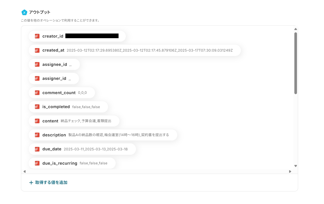 「テスト成功」の結果が表示されますと、「アウトプット」にTodoistから取得した期限切れタスクの一覧が追加されます。