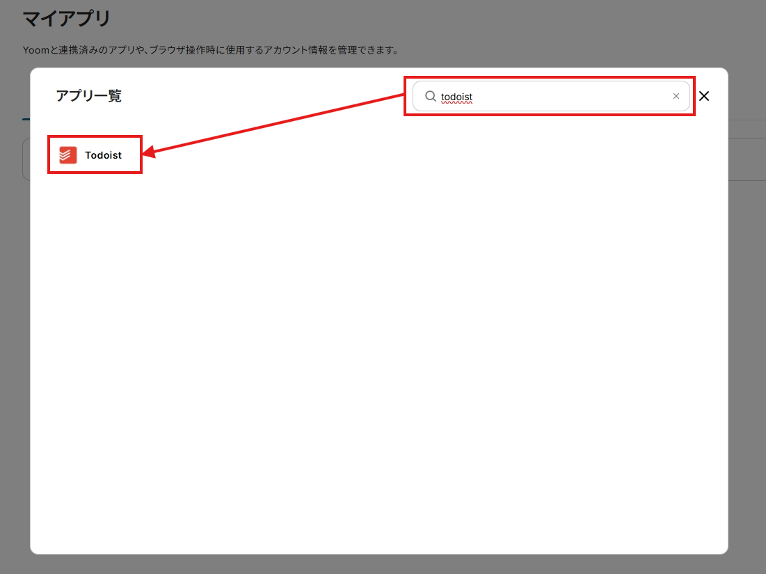「アプリ一覧」が表示されたら、Todoistを検索して選択します。
