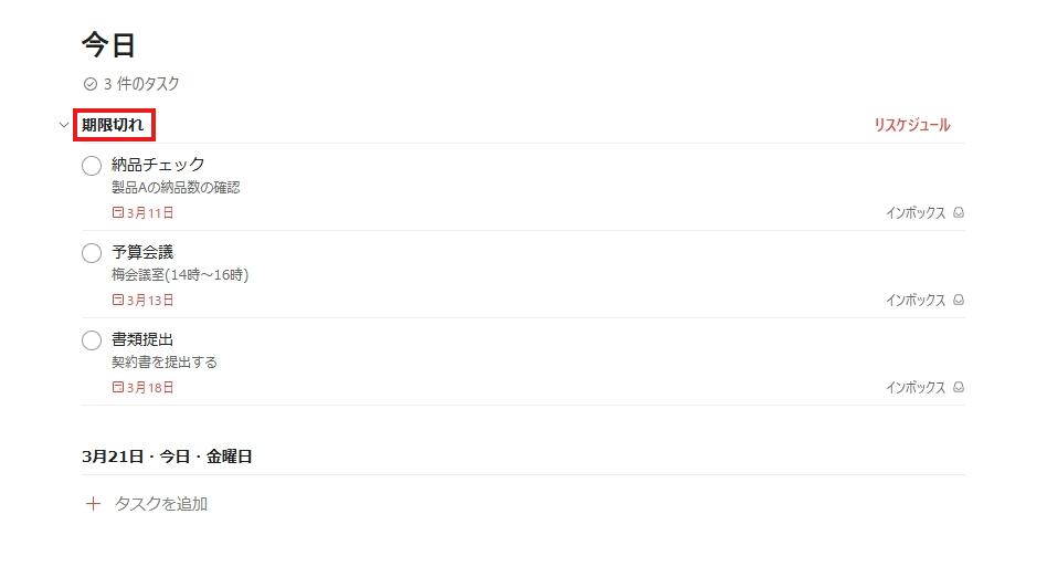 これにより、重要な締め切りや優先すべきタスクを見逃さず、スムーズに業務を進めることができます。
