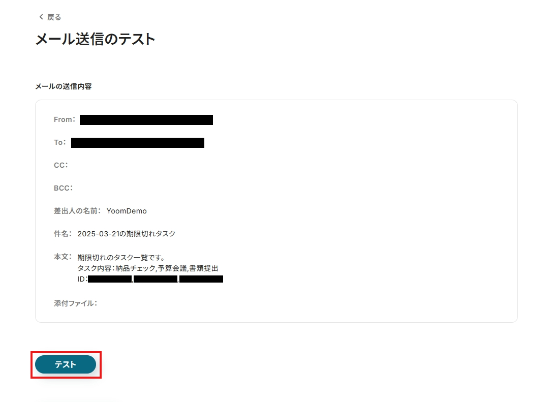 表示されるメール内容を確認し、問題がなければ「テスト」をクリックしてください。