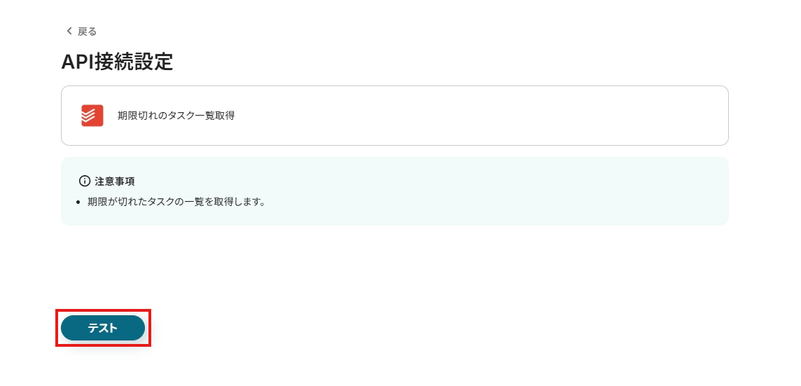 「テスト」をクリックすると、タスク一覧取得のテストが実行されます。