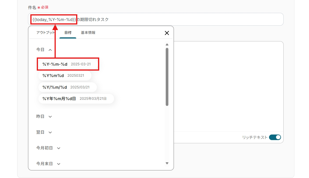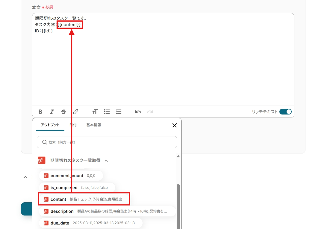 ※ 他にもプルダウンの「アウトプット」の項目から、タスクの内容(content)など、任意のアウトプットを本文に追加できます。