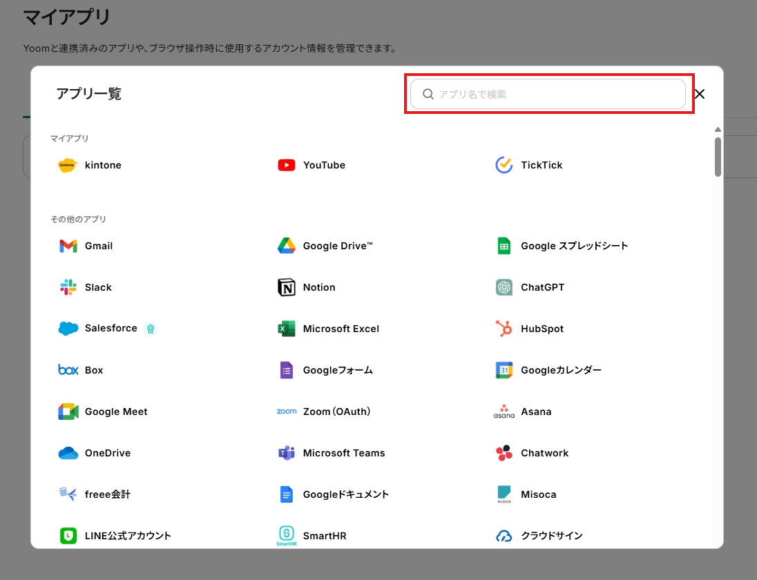 「マイアプリ」で「+新規接続」をクリックした後、「アプリ一覧」が表示されたら、Gmailを検索して選択します。