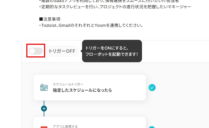 「定期的にTodoistで期限切れのタスクを取得し、Gmailに通知する」フローは、タスク管理の効率化をサポートする業務ワークフローです。