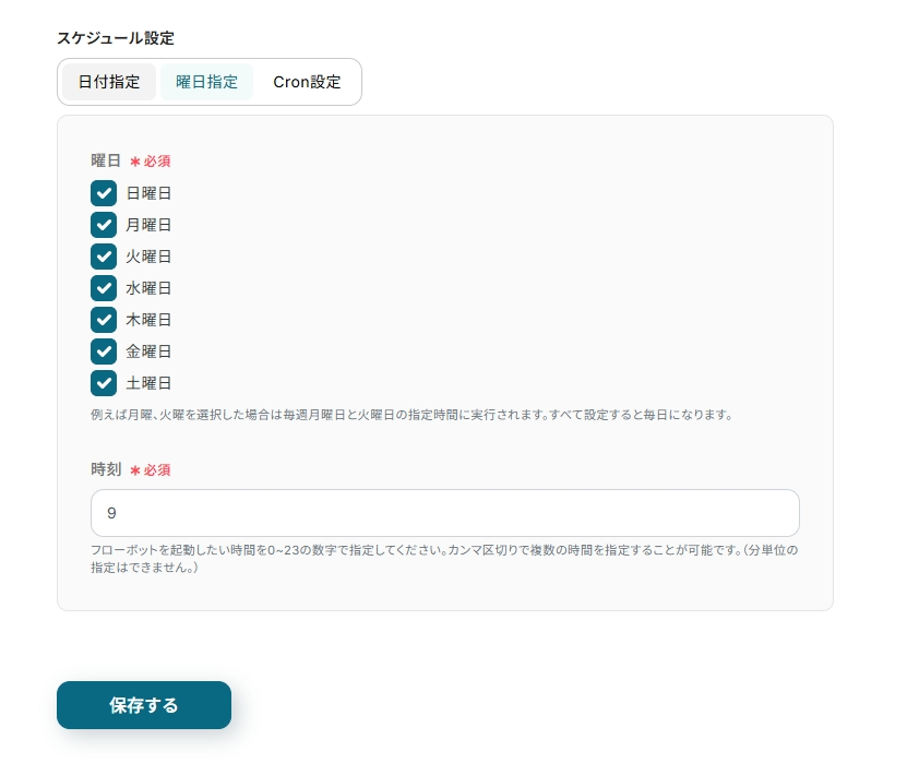 デフォルトでは、全ての曜日(毎日)9時にフローが起動するよう設定されていますので、必要があれば、任意の曜日と時間に変更してください。