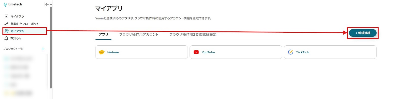 Yoom管理画面のサイドバーから「マイアプリ」を選択し、マイアプリ画面の右側にある「+新規接続」をクリックします。