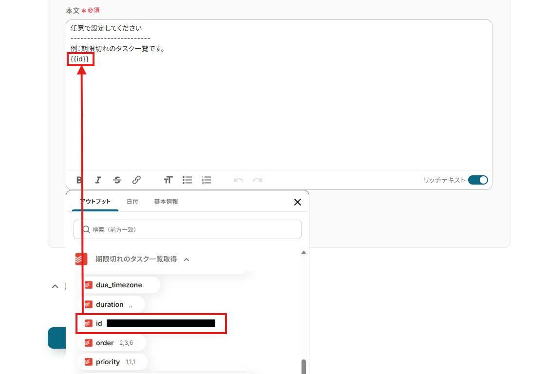 「本文」にデフォルトで設定されている{{id}}が、ステップ4で取得した期限切れのタスク一覧になります。
