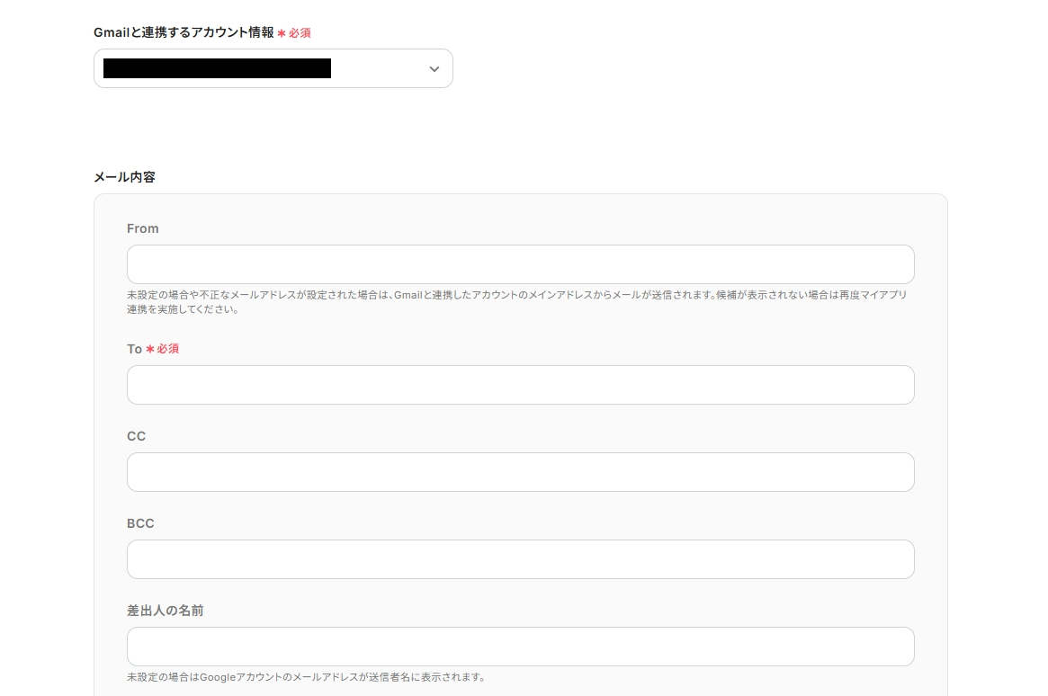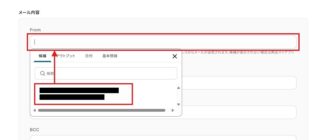 「From」の入力欄をクリックすると、プルダウンに連携しているアカウントが候補として表示されますので、ここから選択していただくことも可能です。