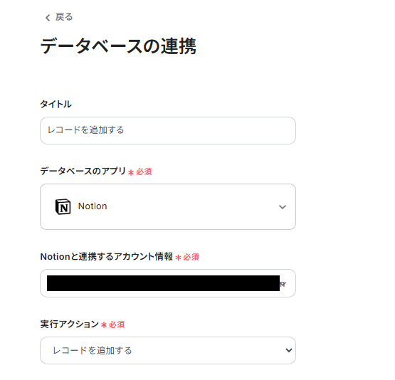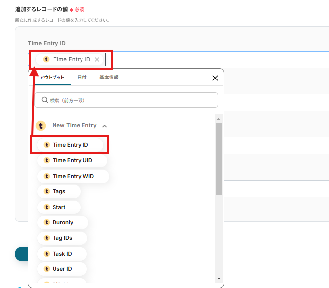 2.詳細設定を行います。 「追加するレコードの値」 の各項目は、ボックスと連動するデータを挿入していきます。 入力欄をクリックして表示されるアウトプットから選択してください。 入力を終えたら「テスト」を実行し、成功したら「保存する」をクリックします。
