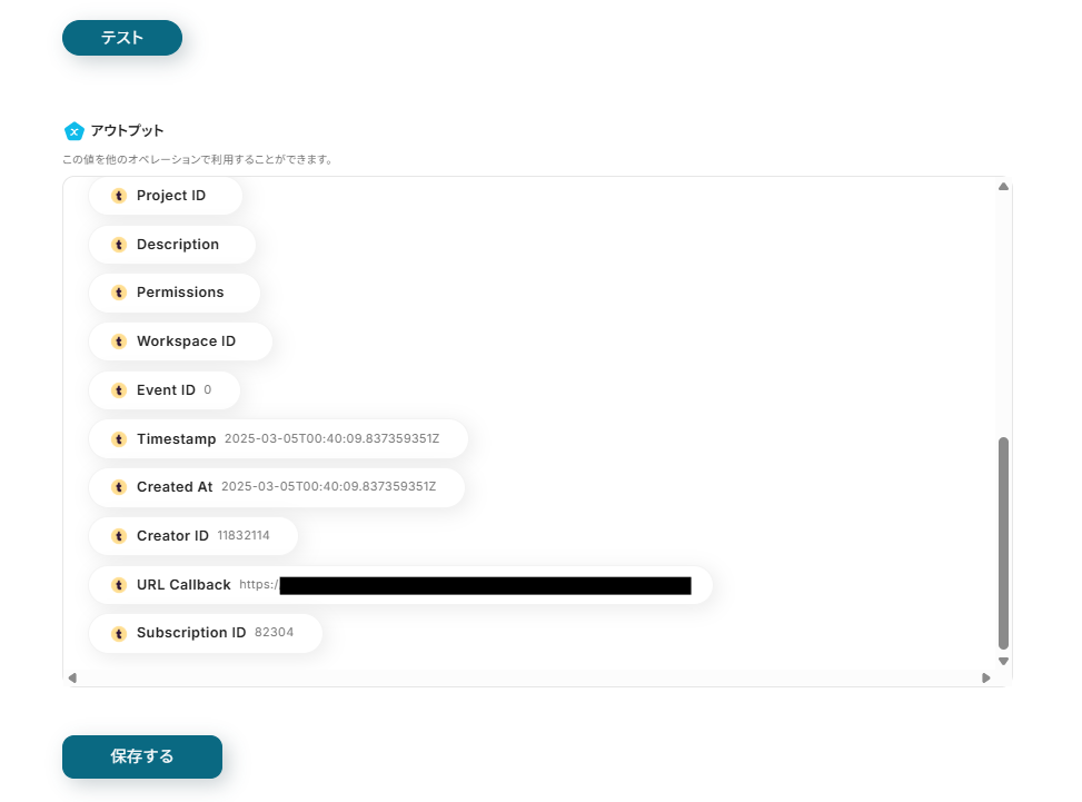 4.表示された画面で、「テスト」を実行し、成功したら「保存する」をクリックします。 ※表示されているアウトプット は「この値を他のオペレーションで利用することができます。」と表記があるように、次の設定でも活用できます。