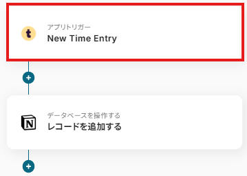 1.先ほどの画面で「OK」をクリックして、表示された画面のアプリトリガー「New Time Entry 」をクリックしてください。 ※こちらの画面は、Yoomページ画面左側「マイプロジェクト」のフローボットで表示される、「【コピー】Togglの新しい時間記録をNotionのデータベースに自動反映する」をクリックすると表示されます。