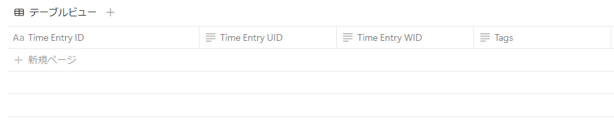 連携前に、Notionにデータベースを作成しておきましょう! ※今回は、以下画像のように作成しました。設定が完了すると、Togglの時間記録情報の値が入ります。